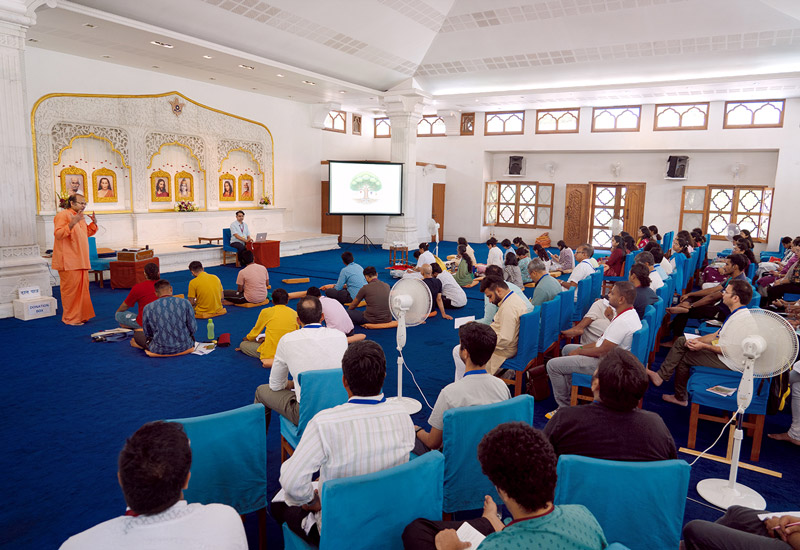 On the penultimate evening, a special kirtan meditation was organized as the highlight of the sangam. As the young sadhaks came out of the Dhyana Mandir, the ashram grounds glowed with thousands of lamps. The Open House that followed gave young sadhaks the opportunity to engage and interact with the sannyasis in the divine atmosphere of the illuminated ashram.
