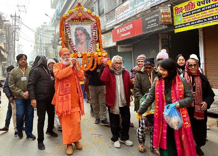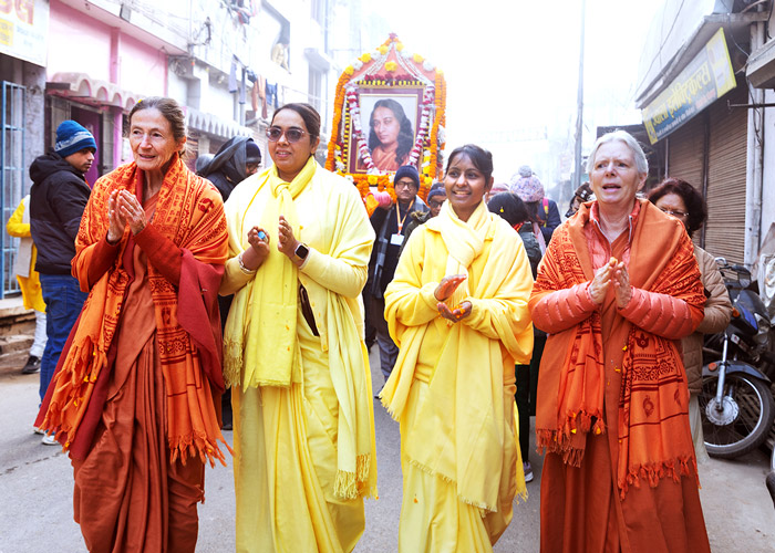 The day’s celebrations began with a Prabhat Feri (procession) along the street approaching Paramahansaji’s birth site. SRF sannyasinis led a beautifully decorated, flower-adorned palanquin carrying a large colour photo of the blessed Guru, Paramahansa Yoganandaji. The procession of around 125 devotees and friends stretched down the length of this street as it neared the sacred birth site of Gurudeva, accompanied by continuous joyous chanting of “Jai Guru.”