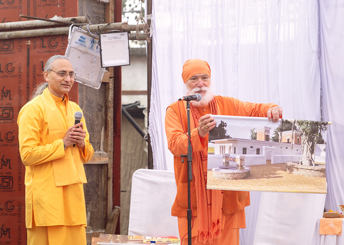 The programme began with senior sannyasi Swami Vishwananda Giri performing aarti to our beloved Guru. This was followed by chanting by the brahmacharinis from SRF. Swami Vishwananda then addressed the gathering, sharing his joy at celebrating Paramahansaji’s 133rd Janmotsav anniversary at this sacred spot. He conveyed global gratitude for the Gorakhpur function, on behalf of the YSS/SRF President and Spiritual Head Swami Chidananda Giri, the YSS/SRF monastics, and the worldwide spiritual family of the great Guru. He also thanked the Uttar Pradesh State Government and all involved in the decision to establish a memorial shrine at the site of Yoganandaji’s birth. He shared large, coloured poster renderings of the original house where Gurudeva was born, and of the now-under-construction shrine. This was received with appreciation and applause from the audience.