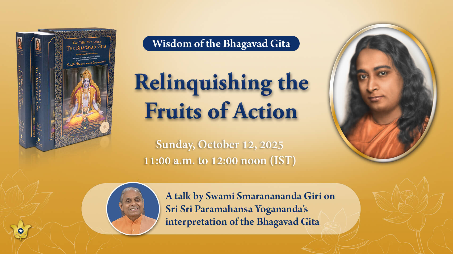 How can we truly live this divine counsel and free ourselves from the binding fruits of action, which cause the soul to return again and again in reincarnation? On October 12, senior sannyasi of Yogoda Satsanga Society of India, Swami Smaranananda Giri, will present a talk in English on verses 47 to 51 of Chapter II of the Bhagavad Gita, titled “Relinquishing the Fruits of Action.”