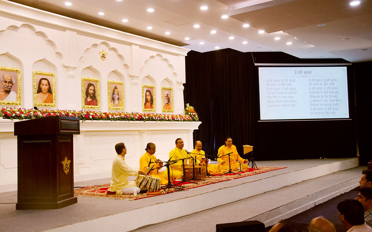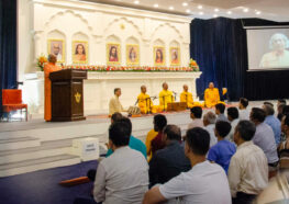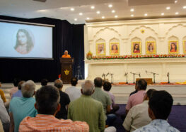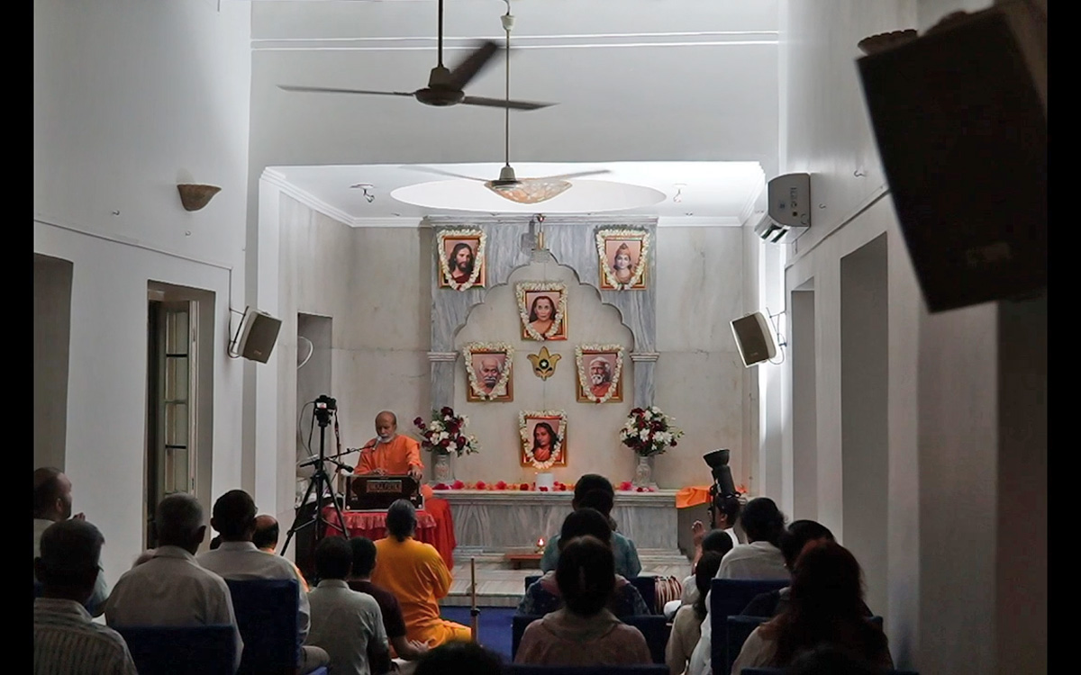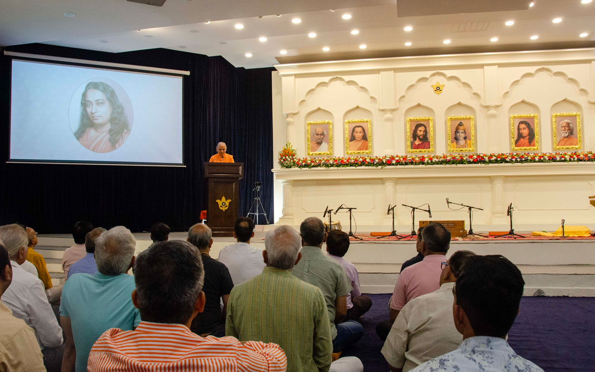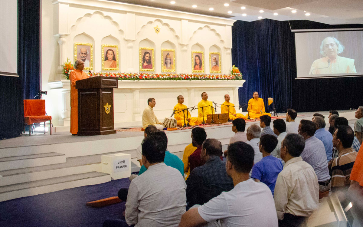 - Swami Smaranananda gives an inspiring introduction at the beginning of the event at YSS Noida ashram.