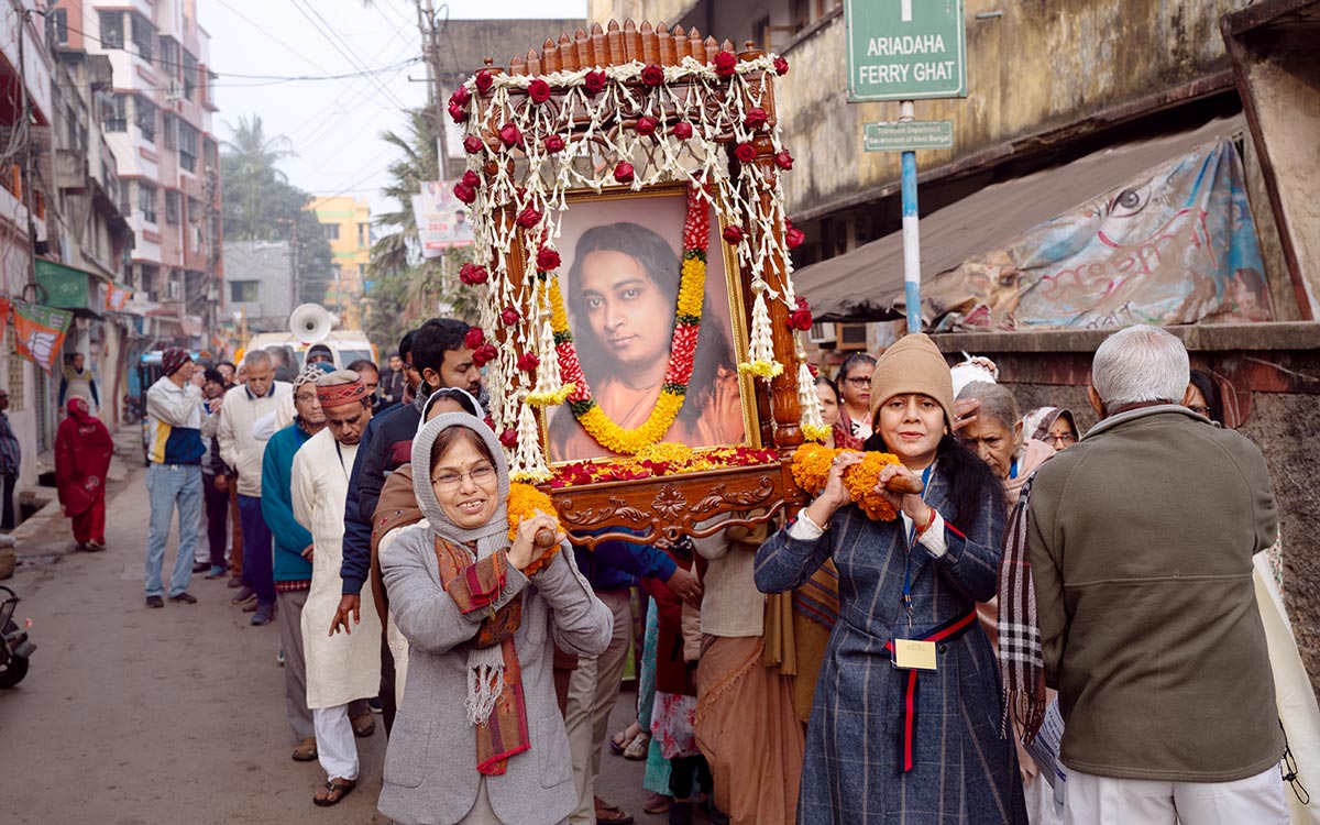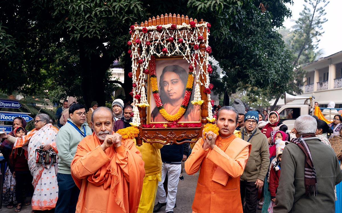 - … followed by devotees taking turns to carry the beautifully-decorated palki with Yoganandaji’s portrait while singing devotional chants.