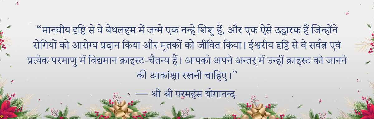 आपको और श्री श्री परमहंस योगानन्द के विश्वव्यापी आध्यात्मिक परिवार और मित्रों को क्रिसमस की हार्दिक शुभकामनाएँ! मैं प्रार्थना करता हूँ कि वर्ष के इस शुभ समय में दिव्य जगतों से प्रकट होने वाली शान्ति और आनन्द के स्पन्दनों से आपके हृदय एवं आत्मा का उत्थान हो।
