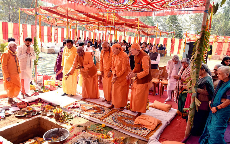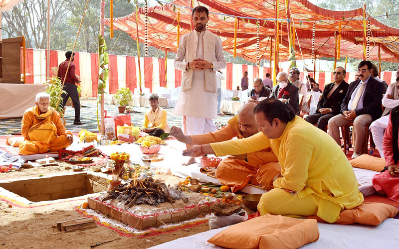 प्रातःकाल पारंपरिक वैदिक अनुष्ठानों के साथ भूमि पूजन प्रारंभ हुआ, जिसमें स्वामी गोकुलानन्द ने यजमान के रूप में परियोजना की सफलतापूर्वक सम्पन्नता हेतु ईश्वरीय आशीर्वाद का आह्वान किया।