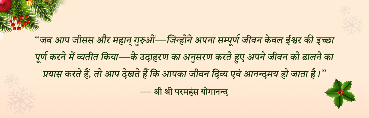 आपको—और श्री श्री परमहंस योगानन्द के सम्पूर्ण विश्वव्यापी आध्यात्मिक परिवार और मित्रों को—हार्दिक, प्रेममय, और आनन्दमय क्रिसमस की शुभकामनाएँ! क्रिसमस के इस पवित्र अवसर पर प्रभु जीसस क्राइस्ट का जन्मोत्सव मनाते हुए, मैं प्रार्थना करता हूँ कि आपके ध्यान की निश्चलता में आप इन परमप्रिय अवतार के असीम क्राइस्ट-प्रेम को और भी अधिक गहनतापूर्वक अनुभव करें। वे अभी भी सम्पूर्ण वैश्विक परिवार को निरन्तर आशीर्वाद प्रदान करते रहते हैं और उसका अध्यात्मीकरण करते रहते हैं।