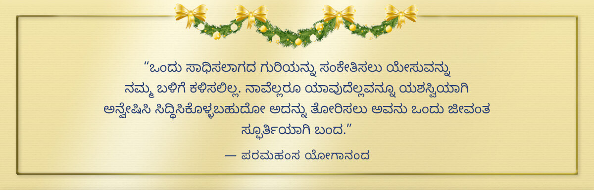 ನಿಮಗೆಲ್ಲರಿಗೂ ಪರಮಹಂಸ ಯೋಗಾನಂದರ ಆಶ್ರಮಗಳಿಂದ ದಿವ್ಯ ಮಿತ್ರತ್ವ ಮತ್ತು ಪ್ರೇಮ ಸಹಿತವಾದ ಆನಂದಮಯ ಕ್ರಿಸ್ಮಸ್ ಶುಭಾಶಯಗಳು! ಆತ್ಮ-ಜಾಗೃತಿಗೊಳಿಸುವಂಥ ಅವರ ದಿವ್ಯಜ್ಞಾನದಿಂದ ಪ್ರಕಟವಾದ ಕ್ರಿಸ್ಮಸ್ನ ನಿಜವಾದ ಅರ್ಥದಿಂದ ನಿಮ್ಮ ಜೀವನವು ಹೊಸದಾಗಿ ಪ್ರಕಾಶಿಸಲ್ಪಡಲಿ — ಕ್ರಿಸ್ಮಸ್ನ ನಿಜವಾದ ಅರ್ಥವೆಂದರೆ, ನಿಮ್ಮ ಆಂತರ್ಯದೊಳಗೆ ಕ್ರಿಸ್ತ [ಕೂಟಸ್ಥ] ಪ್ರಜ್ಞೆಯ ಜನನ, ಅದು ಪ್ರಭು ಯೇಸುವಿನಲ್ಲಿ ಮೂರ್ತೀಭವಿಸಿತ್ತು ಹಾಗೂ ನಿತ್ಯ ಪ್ರೇಮ ಮತ್ತು ದಿವ್ಯ ಸಾಮರಸ್ಯವಾಗಿ ಇಡೀ ಸೃಷ್ಟಿಯಲ್ಲಿ ಸದಾ ಪ್ರಕಾಶಿಸುತ್ತಿದೆ.