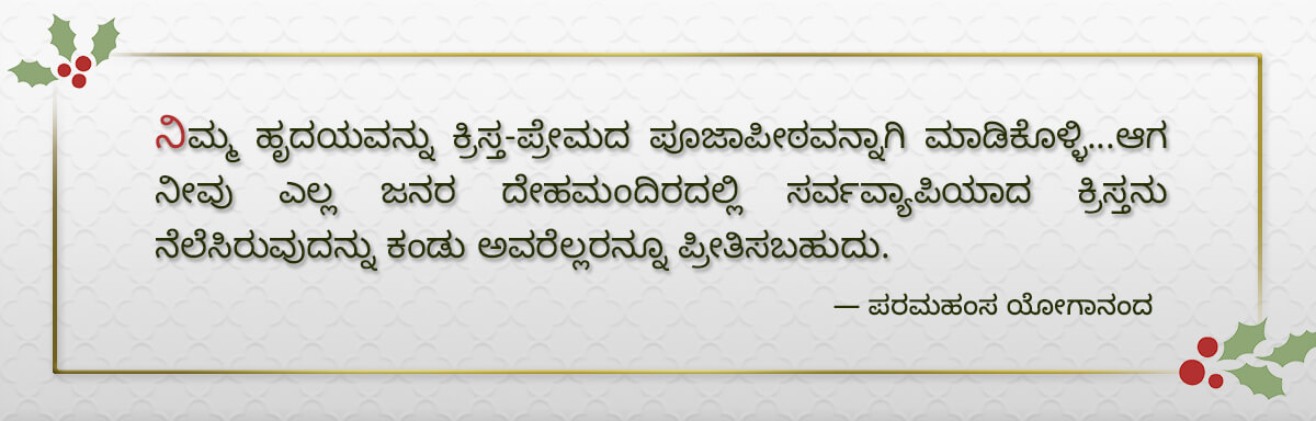 ಸರ್ವವನ್ನೂ ಒಳಗೊಳ್ಳುವ ಕ್ರಿಸ್ತ ಪ್ರಜ್ಞೆಯ (ಕೂಟಸ್ಥ ಚೈತನ್ಯ) ಸಾಕಾರರೂಪವಾಗಿದ್ದ, ಪ್ರೀತಿಯ ಅವತಾರ (ಭಗವಂತನ ವೈಯಕ್ತಿಕ ಆವಿರ್ಭಾವ) ಪುರುಷನಾದ ಯೇಸು ಹಾಗೂ ಮಹಾವತಾರ ಬಾಬಾಜಿ, ಭಾರತದ ಕ್ರಿಯಾಯೋಗವನ್ನು ಪಶ್ಚಿಮಕ್ಕೆ ಹರಡುವ ವಿಷಯದಲ್ಲಿ ಶಾಶ್ವತ ಸಂಬಂಧ ಹೊಂದಿದ್ದಾರೆ. ಯೇಸು ಮತ್ತು ಬಾಬಾಜಿಯವರ ಆಜ್ಞೆಯ ಮೇರೆಗೆ ಪರಮಹಂಸ ಯೋಗಾನಂದರು ವಿಶ್ವಾದ್ಯಂತ ಪ್ರಸರಿಸಿದ ಭವ್ಯವಾದ ಬೋಧನೆಗಳು ಮತ್ತು ತಂತ್ರಗಳ ಮೂಲಕ ಅನಂತತೆಯ ಕ್ರಿಸ್ತ ಶಿಶುವಿನ ಜನನಕ್ಕಾಗಿ ನಮ್ಮಲ್ಲಿನ ಪ್ರತಿಯೊಬ್ಬರಿಗೂ ನಮ್ಮ ಹೃದಯದಲ್ಲೇ ತೊಟ್ಟಿಲನ್ನು ಸಿದ್ಧಪಡಿಸುವ ಸಾಧನವನ್ನು ನೀಡಲಾಗಿದೆ. ಧ್ಯಾನದಲ್ಲಿ ಆ ಪವಿತ್ರ ಪ್ರಜ್ಞೆಯೊಂದಿಗಿನ ಸಂಸರ್ಗದಿಂದ, ನಾವು ನಿಜವಾದ “ಕ್ರಿಸ್ತನ ಎರಡನೇ ಬರುವಿಕೆಯನ್ನು” ನಮ್ಮೊಳಗೇ ಕಂಡುಕೊಳ್ಳುತ್ತೇವೆ. ಈ ಪವಿತ್ರ ಋತುವಿನಲ್ಲಿ ಸ್ವರ್ಗೀಯ ಸ್ತರಗಳಿಂದ ವಿಶೇಷ ಶಕ್ತಿಯೊಂದಿಗೆ ಹೊರಹೊಮ್ಮುವ ದಿವ್ಯ ಕಾಂತೀಯತೆ ಮತ್ತು ಅನುಗ್ರಹಗಳು ನಿಮ್ಮ ಧ್ಯಾನಸ್ಥ ಆತ್ಮವನ್ನು ಭಗವಂತನ ಪ್ರೀತಿಪೂರ್ವಕ ಮತ್ತು ಬದುಕನ್ನು ಪರಿವರ್ತಿಸುವ ಉಪಸ್ಥಿತಿಯಲ್ಲಿ ಆಳವಾಗಿ ಸೆಳೆಯಲಿ ಎಂಬುದೇ ನನ್ನ ಹೃತ್ಪೂರ್ವಕ ಪ್ರಾರ್ಥನೆಯಾಗಿದೆ. ಇದು ಎಲ್ಲಾ ಜೀವಿಗಳನ್ನು ಒಂದು ದಿವ್ಯ ಕುಟುಂಬದಲ್ಲಿ ಒಂದುಗೂಡಿಸುತ್ತದೆ. ಇದೇ ಕ್ರಿಸ್ಮಸ್ನ ನಿಜವಾದ, ಆಧ್ಯಾತ್ಮಿಕ ಆಚರಣೆ, ಇದನ್ನೇ ಪ್ರಪಂಚದಾದ್ಯಂತದ ಪರಮಹಂಸಜಿಯವರ ಅನುಯಾಯಿಗಳು ವರ್ಷದ ಈ ಸಮಯದಲ್ಲಿ ತುಂಬಾ ಎದುರು ನೋಡುವುದು.