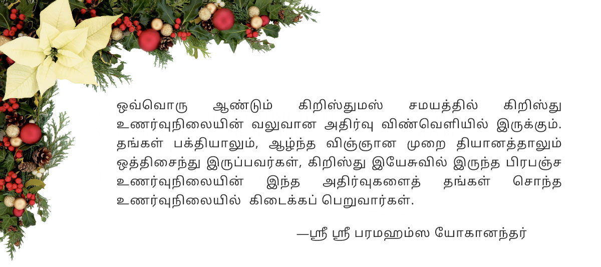 கிறிஸ்மஸ் புனித பருவத்தில், அனைத்து படைப்புகளிலும் பரவும் எல்லையற்ற கிறிஸ்துவின் பிரகாசிக்கும் அன்பினாலும் ஆனந்தத்தினாலும் முழு உலகமும் மிகவும் உணரக்கூடிய வகையில் ஆசீர்வதிக்கப்படுகிறது. அது உங்கள் வாழ்க்கையை புதுப்பிக்கப்பட்ட நம்பிக்கை மற்றும் ஏற்புத்திறன் மிக்க இதயங்களில் மேம்படுத்தும், ஒத்திசையச் செய்யும் தாக்கத்தை எப்போதும் ஏற்படுத்த முயலும் இறைவனின் மகிமை மற்றும் அன்பின் வல்லமை மீதான விசுவாசத்துடன் ஒளிரச் செய்யப் பிரார்த்திகிறேன். உலகளாவிய கிறிஸ்து உணர்வுநிலை [கூடஸ்த சைதன்யா] முழுவதுமாக வெளிப்பட்ட இயேசுவின் பிறப்பைப் பற்றிய நமது மகிழ்ச்சியான கொண்டாட்டம், நாமும் கூட இறைவனின் ஒளியில் பிறந்தவர்கள், அவருடைய எல்லையற்ற உணர்வுநிலையையும் அன்பின் ஆற்றலையும் பிரதிபலிக்கும் திறனைப் பெற்றுள்ளோம் என்ற உணர்வை நம்மில் எழுப்பட்டும்.