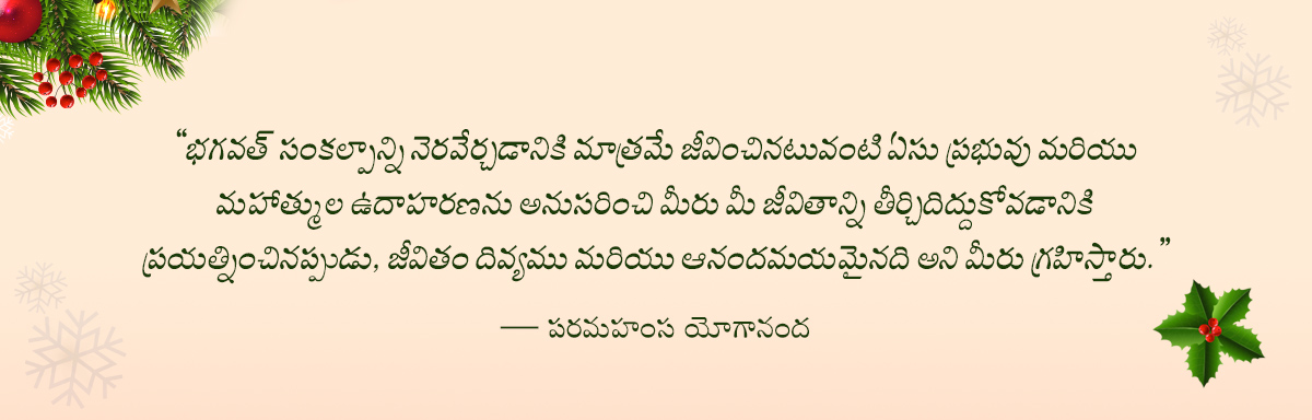 మీకు, పరమహంస యోగానందగారి ప్రపంచవ్యాప్త ఆధ్యాత్మిక కుటుంబానికి మరియు మిత్రులందరికీ హృదయపూర్వక, ప్రేమమయ, ఆనందభరిత క్రిస్మస్ శుభాకాంక్షలు! ప్రభువైన ఏసుక్రీస్తు జననాన్ని మనం ఈ పవిత్ర పర్వదినాన జరుపుకుంటున్న సందర్భంలో, మీ ధ్యాన నిశ్చలతలో, ఈ ప్రియతమ అవతారుని యొక్క ఎల్లలు లేని క్రీస్తు ప్రేమను మీరు ఎప్పటికంటే మరింత గాఢంగా అనుభూతి చెందాలని నేను ప్రార్థిస్తున్నాను. ఆ ప్రేమ ప్రపంచ కుటుంబమంతటికి నిరంతరం దీవెనలనందిస్తూ, దానిని ఆధ్యాత్మీకరిస్తూ ఉంటుంది.