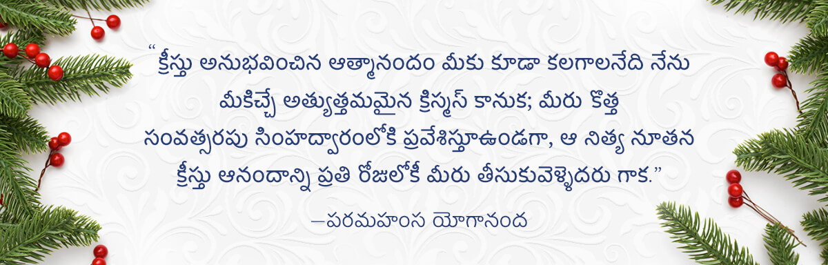 పరమహంస యోగానందగారి ఆశ్రమాల నుండి మీకు మా శుభాకాంక్షలు! ఆధ్యాత్మిక వాగ్దానాన్ని ప్రసాదించే పవిత్ర ఋతువులోకి మనం ప్రవేశించేటప్పుడు ఒక సాంత్వనకారక దైవిక శాంతి మరింత బలంగా అనంతమైన కూటస్థ చైతన్యం — సృష్టిలో పరివ్యాప్తమైన భగవంతుడి ప్రేమపూర్వక, సర్వవ్యాప్త ఎరుక — నుండి వెలువడుతుంది. మనలను మనం గ్రహణశీలంగా చేసుకుంటే ఉద్ధారకారకమైన ఆ ప్రశాంత స్పందనలు మన అసలైన ఆత్మతత్వాన్ని మనకు నిశ్చితంగా అనుభూతి చెందించడం ద్వారా మనలను గాఢంగా పరిణామం చెందించగల శక్తి కలిగి ఉంటాయి. జాగృతపరిచే ఆ ఆత్మగ్రాహ్య శక్తి అనే బహుమతి — మన ప్రియతమ దివ్య పరమాత్మ ఎంతో శ్రద్ధతో చుట్టి, మీ పేరు లిఖించి తన పరిపూర్ణ సౌకుమార్యతతో మీ చేతుల్లో పెట్టాలని ఈ క్రిస్మస్ శుభ సమయంలో నేను ప్రార్థిస్తున్నాను.